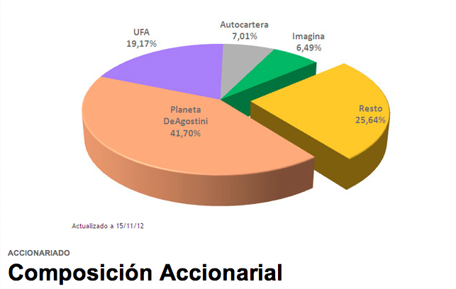 Antena 3 también cotiza en bolsa y por lo tanto también analizaremos su composición accionarial. La dividiríamos principalmente en cuatro grupos importantes: Planeta DeAgostini, UFA, Autocartera e Imagina. Las porciones de la empresa se dividien en los siguientes porcentajes que expresaremos con una gráfica.